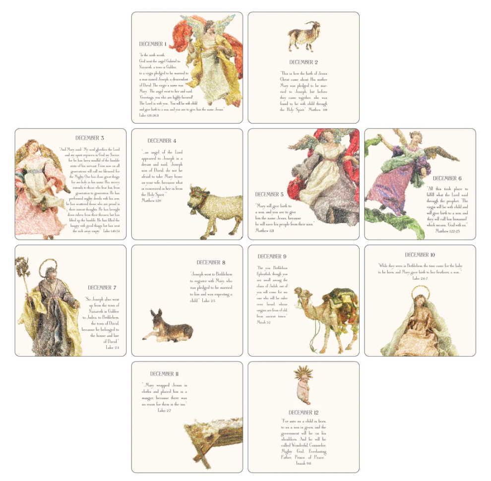 Our Classical Advent Calendar is printed on 100lb smooth ecru cardstock, ensuring a durable and luxurious feel. Each of the 24 5 ½ inch square cards features a classical nativity image, following the Christmas story with a new scene each day. The cards have rounded corners, adding a touch of elegance to the design. Included with the calendar is a metallic gold metal easel, thoughtfully designed to display each day's card with grace and sophistication. This sturdy and elegant easel enhances the reverent charm of the calendar, making it a perfect addition to any room during the holiday season.