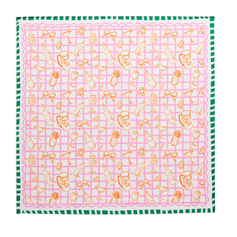 Add a splash of fun to your summer accessories with the Spritz Scarf. This silky square scarf features a playful cocktail-themed print in sunny orange, punchy pink, and fresh green hues. With tropical drinks, pineapples, and citrus slices dancing across a pink grid background, it’s the perfect pop of color for beach bags, ponytails, or neck ties. Lightweight and versatile, this scarf instantly turns any outfit into a celebration.