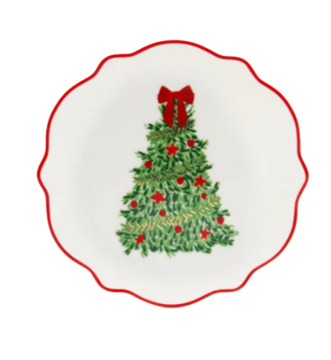 Deck the halls with this charming appetizer plate featuring a festive tree design adorned with elegant gold detailing. The scalloped edges add a touch of vintage sophistication, making it perfect for holiday gatherings, seasonal entertaining, or year-round festive vibes. Whether you're serving up appetizers, cookies, or small bites, this delightful plate brings warmth and whimsy to your table. A playful way to celebrate the season in style!