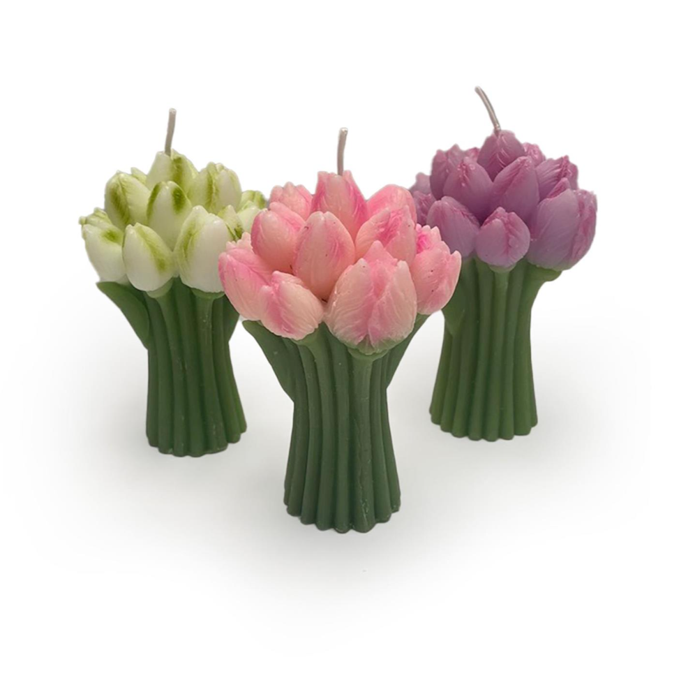 - Sculpted tulip bouquet candle in assorted colors: white, pink, and purple